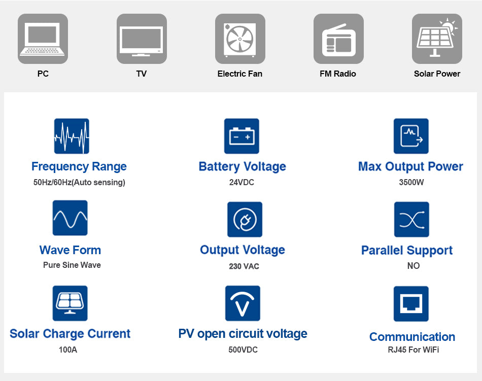 This is a multi-function inverter charger, combining functions of inverter, solar charger and battery charger to offer uninterruptible power support with portable size. Its comprehensive LCD display offers user-configurable and easy-accessible button operation such as battery charging current, AC/solar charger priority, and acceptable input voltage based on different applications.