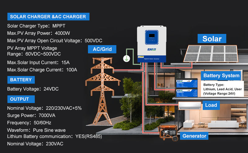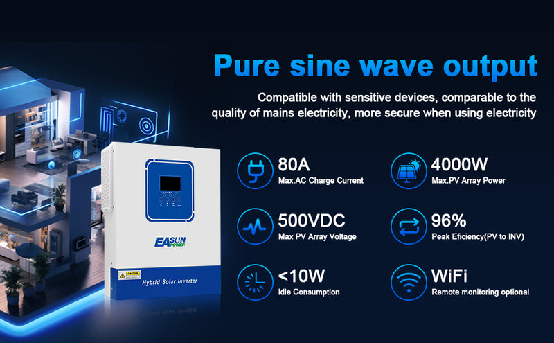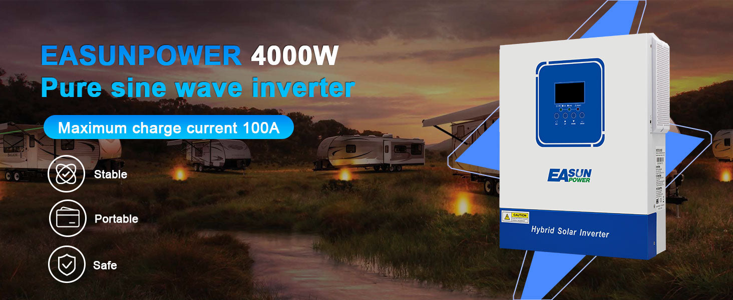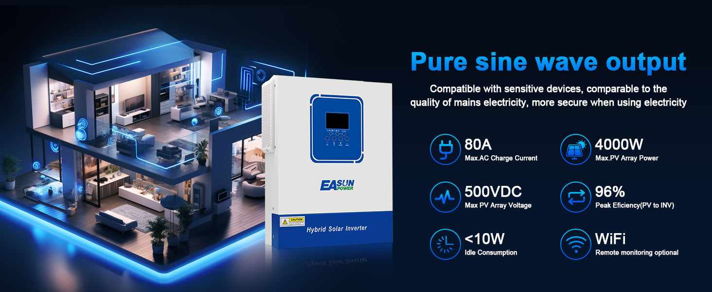 The EASUN 24V 4000W solar inverter integrates solar input, grid power, and battery charging, providing seamless charging, stable power output, and reliable backup power. Easily build a complete and professional home energy system. With simple installation and stable operation, it delivers a long-lasting, reliable green power experience for both home and commercial use.