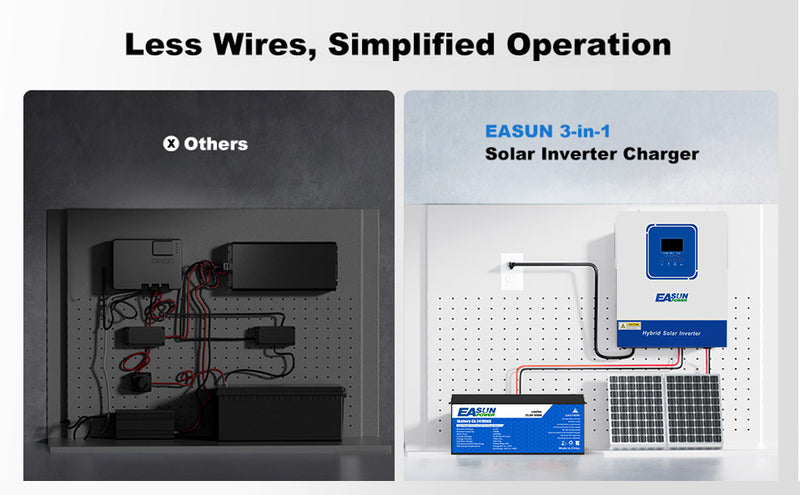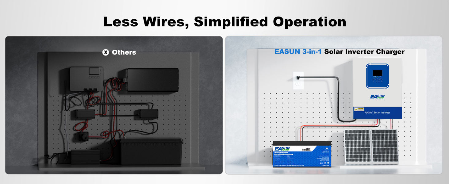Say goodbye to messy wiring and scattered components! The EASUN POWER solar inverter charger integrates MPPT, inverter, and charger into a compact unit — saving installation space, simplifying wiring, and making your home energy system cleaner, safer, and easier to manage.